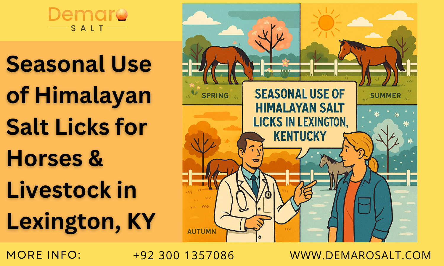 This vibrant digital illustration captures a knowledgeable vet offering tips on the seasonal use of Himalayan salt licks to a horse farm owner in Lexington, Kentucky. The scene is divided into four seasonal panels—spring, summer, autumn, and winter—each showing how salt lick usage varies with weather, horse activity, and hydration needs. Ideal for educational and blog content on equine care, especially in changing climates.